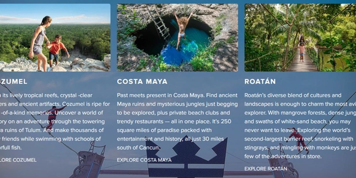 Set sail on a 6-night jorney from Galveston to the top-rated shores of the Western Caribbean. Become one with nature at the breathtaking Punta Sur National Park in Cozumel. Dive into adventure in Costa Maya at the Great Maya Reefs. And in Roatán, dig your toes into powdery white sand beaches.